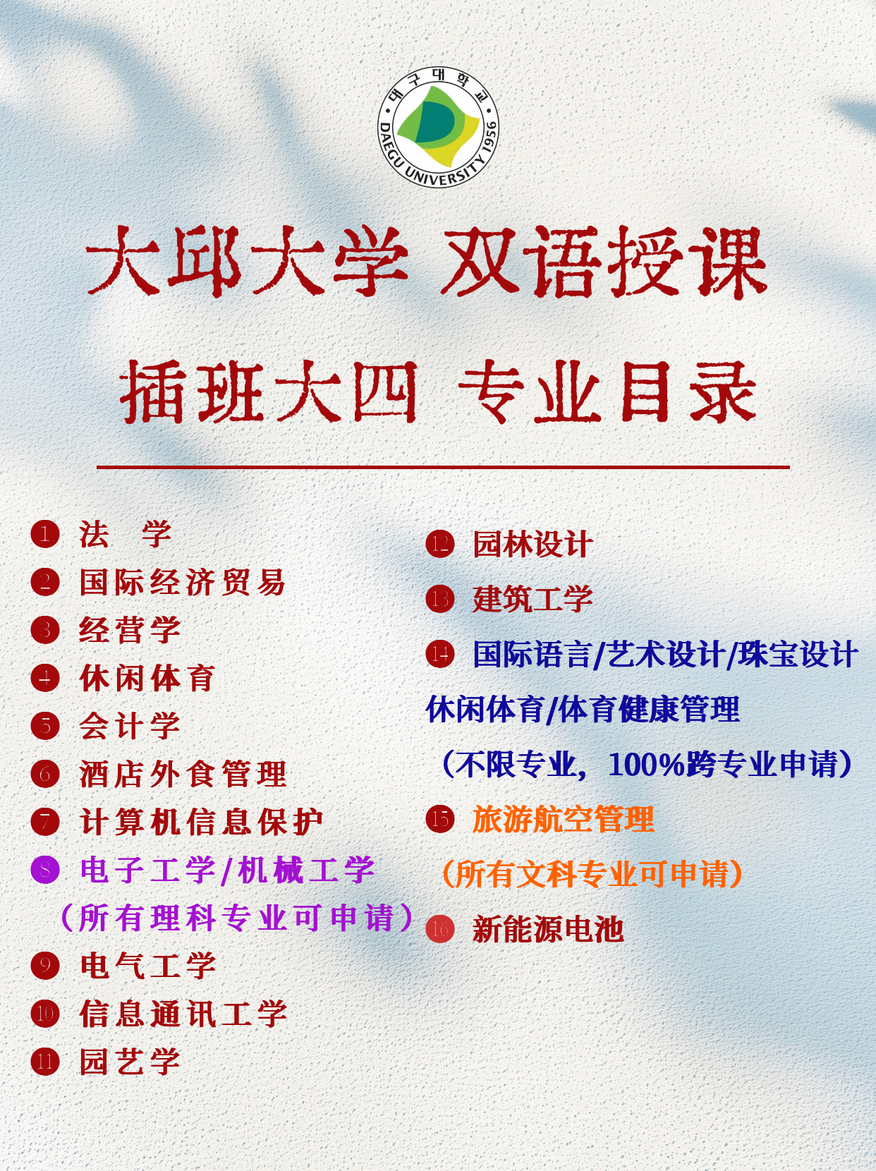 | 工科类 | 电子工学、机械工学、电气工学、信息通讯工学、计算机信息保护、新能源电池 | 理科专科背景 |